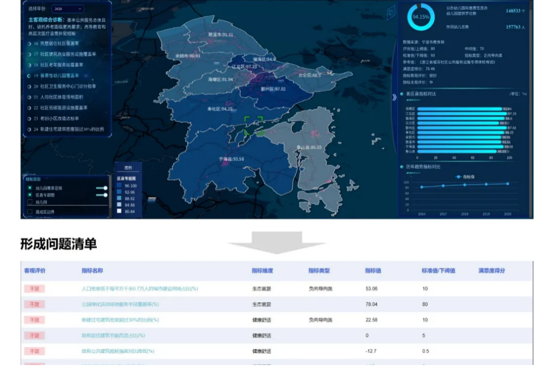 寧波作為全國(guó)城市體檢樣本城市,創(chuàng)新體檢工作方法,推動(dòng)體檢成果應(yīng)用成為體檢工作的關(guān)鍵。現(xiàn)階段寧波已建立起“內(nèi)容構(gòu)建-數(shù)據(jù)采集-計(jì)算評(píng)價(jià)-診斷建議-行動(dòng)落實(shí)”的智慧評(píng)估體系,以“體征采集—體征分析—問(wèn)題診斷—場(chǎng)景應(yīng)用”為評(píng)估信息平臺(tái)建設(shè)的主脈絡(luò),構(gòu)建“1+3+X”的功能框架,逐步形成了以“診斷分析、監(jiān)測(cè)預(yù)警、輔助決策”為核心的智慧評(píng)估閉環(huán)。評(píng)估平臺(tái)以客觀(guān)指標(biāo)為基礎(chǔ)、居民問(wèn)卷調(diào)查為補(bǔ)充,精準(zhǔn)查找居住環(huán)境、社區(qū)服務(wù)存在的問(wèn)題,匯集而成社區(qū)養(yǎng)老服務(wù)設(shè)施覆蓋率、社區(qū)衛(wèi)生設(shè)施覆蓋率、社區(qū)低碳能源設(shè)施覆蓋率、公交站覆蓋社區(qū)占比、人均避難場(chǎng)所有效避難面積等16類(lèi)成果數(shù)據(jù)和分析結(jié)果,綜合反應(yīng)城市發(fā)展、人居環(huán)境的短板,為民政、衛(wèi)健、交通、應(yīng)急等多部門(mén)分類(lèi)提供城市體檢中所遇到的具體問(wèn)題、核心內(nèi)容并制定相應(yīng)解決措施,從而加快城市體檢成果。