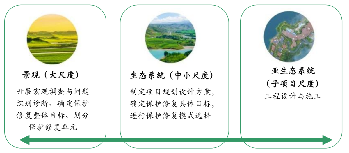 從大尺度向小尺度或從小尺度向大尺度進(jìn)行梯度分析、類比分析、綜合評(píng)判,分析評(píng)價(jià)區(qū)域生態(tài)空間格局,生態(tài)系統(tǒng)質(zhì)量及服務(wù)功能,特別是珍稀瀕危物種及棲息地狀況,科學(xué)診斷生態(tài)系統(tǒng)的脆弱性、敏感性,以及受損的面積、分布、程度。并針對(duì)不同層次解決的問(wèn)題及保護(hù)修復(fù)目標(biāo),確定各尺度上開展的工作。