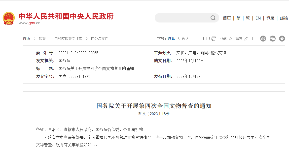 新中國成立以來,我國已開展過三次全國文物普查。2007年至2011年,第三次全國文物普查(以下簡稱“三普”),全國共登記地上、地下、水下不可移動文物766722處。黨的十八大以來,習(xí)近平總書記高度珍視歷史文化遺產(chǎn),明確要求“要建立健全歷史文化遺產(chǎn)資源資產(chǎn)管理制度,建設(shè)國家文物資源大數(shù)據(jù)庫”。開展第四次全國文物普查,是貫徹落實習(xí)近平總書記重要指示批示的重要措施。將我國境內(nèi)地上、地下、水下,人類創(chuàng)造的或者與人類活動有關(guān)的,具有歷史、藝術(shù)、科學(xué)價值的物質(zhì)文化遺產(chǎn)作為普查對象,通過普查明確全國不可再生、不可替代的不可移動文物資源總量。根據(jù)國務(wù)院《關(guān)于開展第四次全國文物普查的通知》國發(fā)〔2023〕18號文件,于2023年11月起開展第四次全國文物普查,落實黨中央決策部署,全面掌握我國不可移動文物資源情況,進(jìn)一步加強(qiáng)文物管理工作。