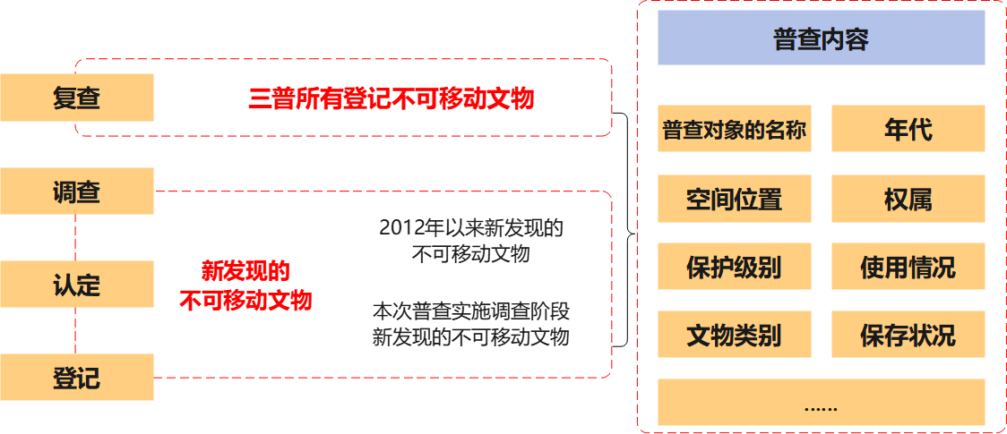 (2)普查對已認(rèn)定、登記的不可移動文物進(jìn)行復(fù)查,同時調(diào)查、認(rèn)定、登記新發(fā)現(xiàn)的不可移動文物。普查的主要內(nèi)容如下: