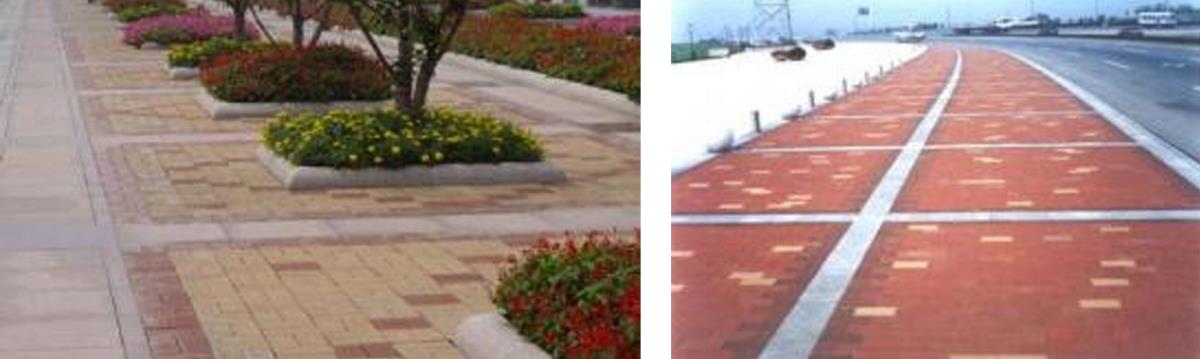 自行車道對于鋪裝平整度的要求與步行道相同,但對于圖案樣式與質(zhì)感變化的要求稍低。在自行車道的重要決策點,包括起止點、轉(zhuǎn)折點和機非潛在沖突路口或路段等,可變換顏色,采用彩色鋪裝的形式,從而提示使用者注意前方路況或行駛安全。此外,采用不同顏色的彩色自行車道路面鋪裝可將機動車道與非機動車道清晰地進行分隔,既減少不必要的隔離設(shè)施、節(jié)約道路空間,又比傳統(tǒng)劃線分隔更加清楚明朗,建設(shè)費用更低。